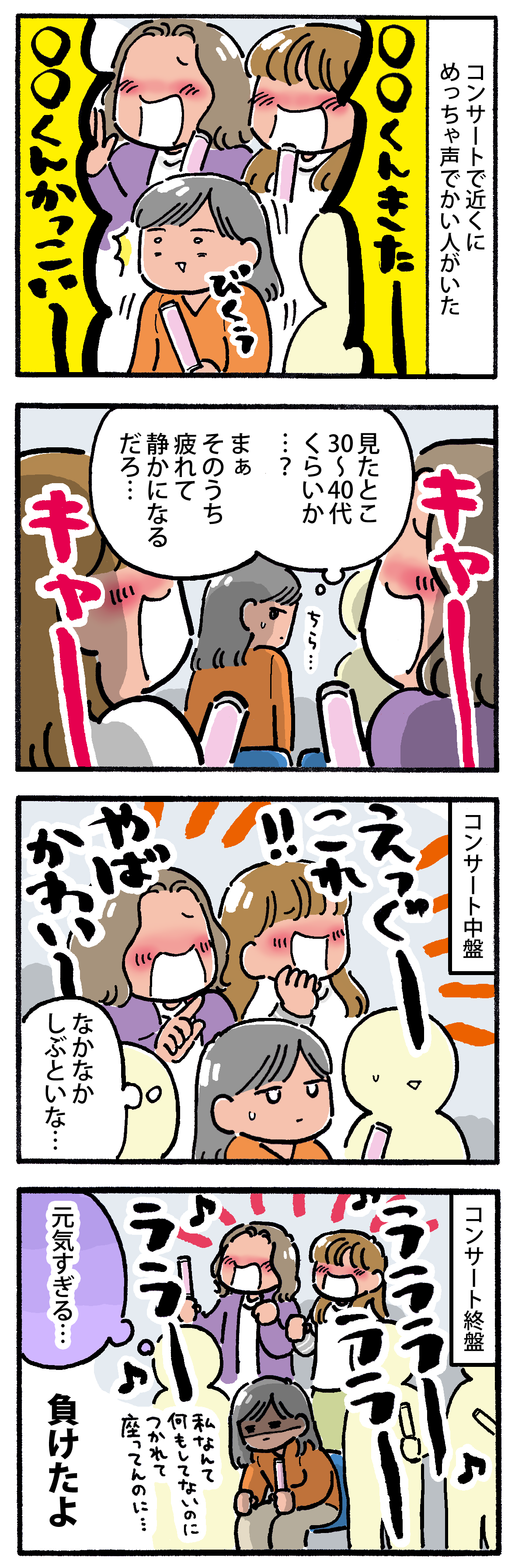 コンサートで近くにめっちゃ声でかい人がいた 2024年06月22日 私と同年代くらいなのになんでそんな元気なの…?▼ティーンでさえ後半は静かになるというのに… ▼ランキングに参加しています↓押して応援してもらえると嬉しいです!▼Xとインスタで更新のお知らせしてます < 前の記事次の記事 > コメント コメント一覧 (4) 1. ひなた 2025年05月16日 12:24 おはようございます。いつもありがとうございます。 M子さんの作品本当に楽しくて、頷くこともすごく多いし嬉しく拝見させていただいております。 大声で叫ぶのも本当に嫌だけど 大声で一緒に歌うのもやめて頂きたい(大文字で赤字で書きたい) あなたの歌を聴きにきたのではない。断固としてない。 私は推しグループの歌を聴きにきたのだ。 と、声を最大ボリュウムにして叫びたい(大声はやめましょう) 昔、あまりに大声で歌っている後ろの席の方に 「もう少し声落として歌っていただけますか?彼らの声が聴こえないので」と 優しい笑顔で言った事があります(ただし目は笑っていない) 0 M子 がしました 2. M子 2025年05月16日 22:42 >>1 ひなたさん、こんばんは😊 こちらこそたくさん見に来ていただいて、コメントもありがとうございます❣️ 大声で歌う人いますね〜笑 あれって自分の歌声で推しの歌声かき消されてないんでしょうか?もはや推しの歌聴いてないのではって思います😂 すごい!!ひなたさんはそういう人に注意ができる方なのですね!! 私小心者で何も言えないので、近くの席にいてくれたらとてもありがたい存在の方です😭🙏✨️ 0 M子 がしました 3. ひなた 2025年05月17日 13:25 >>2 M子さん こんにちは。 ・うちわをめちゃくちゃ高く上げる人 ・アリーナ席で雑誌(コロコロコミックみたいな厚い雑誌)を重ねてその上に立つ人 にはご注意させていただいたことがあります。 ただ、うちわを挙げている人は肩を叩こうが、声で注意しようが 絶対に下げない方もいます。意地でも下げない。 頭の上のほ~ぉにうちわ掲げて必死に叫びますがだいたい干されます(爆) 一度、ほんとに何も見えなかったので肩を叩き続けましたが無視されて それを見ていた私の隣の方も一緒に肩とんとんしてくださってꉂꉂღ(>ᗜ<*)༡𐤔𐤔𐤔 結局下げてくれたけれど終演後、振り返って般若面の形相で睨まれました。 それが年配者の方で私と同年代と思われ・・・ まあ年ではないよねえ、と思ったのも懐かしい思い出です。 0 M子 がしました 4. M子 2025年05月18日 17:39 >>3 ひなたさん、こんにちは🌞 注意されても絶対下げない人が?!やばすぎますね😂 般若面の形相…怖いですね〜…自分は悪くないと思ってるんでしょうね、認知の歪みを感じます😭 でも大きなトラブルにならなくてよかったですね🥲 ほとんどがマナー守ってる常識的なファンだけど、たまにいますよねすごく変なファン😭 0 M子 がしました コメントフォーム 名前 コメント 記事の評価 リセット リセット 顔 星 情報を記憶 コメントを投稿する