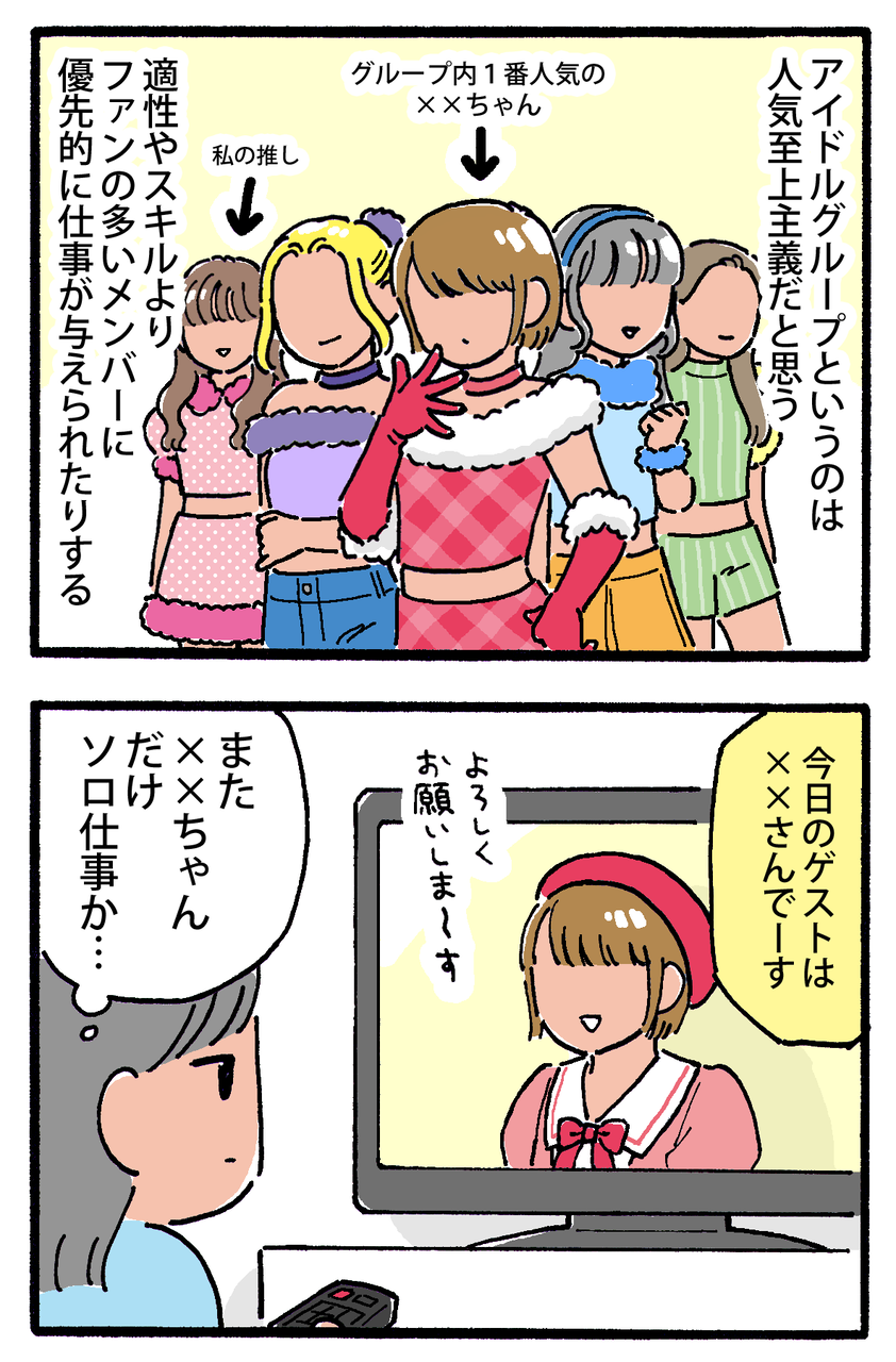推されメンじゃない方のおたくの葛藤 2024年12月08日 (ご無沙汰の更新になってしまいました!)完全に逆恨みです😇▼ランキングに参加しています↓押して応援してもらえると嬉しいです!▼Xとインスタで更新のお知らせしてます < 前の記事次の記事 > コメント コメント一覧 (2) 1. 匿名 2024年12月08日 19:55 草草草 なるほどー、そんな風になるんですねw 私が強烈に沼ったのはソロの人だったし、 グループ系アイドルを好きになった時は既に売れっ子の段階で好きになってたので、気楽なもんでした イラストだと、一番人気の子とM子さんの推しが可愛さの双璧!って感じがします笑 0 M子 がしました 2. M子 2024年12月09日 18:24 >>1 そうなんです、ソロや売れっ子だと気楽に見ていられますよね!私の推しがいるグループはまだまだこれからなので見ていてついやきもきしてしまうんですよね~😭 ファン数では一番人気の子には及ばないかもしれませんが、私の中では推しが世界一可愛い女の子です🥹🫶 0 M子 がしました コメントフォーム 名前 コメント 記事の評価 リセット リセット 顔 星 情報を記憶 コメントを投稿する