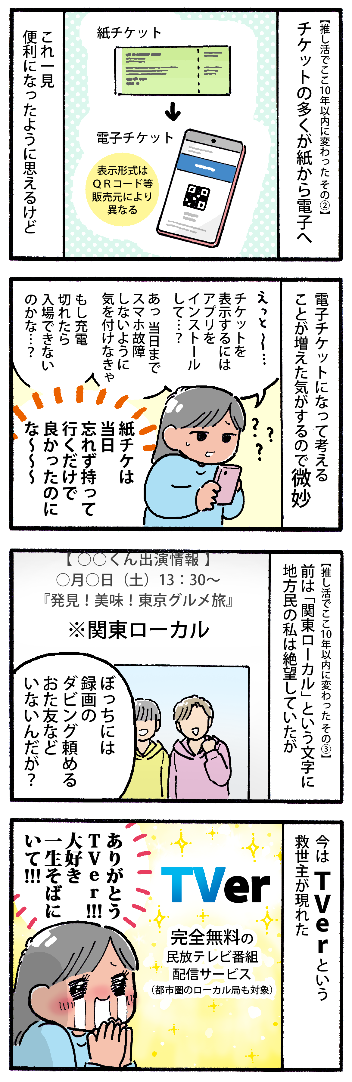 推し活でここ10年以内に変わったと感じること3選 2025年05月06日 他にもたくさんありそう🤔▼ランキングに参加しています↓押して応援してもらえると嬉しいです!▼Xとインスタで更新のお知らせしてます < 前の記事次の記事 > コメント コメント一覧 (4) 1. みりん 2025年05月06日 23:25 全て同意です🤭✨ 電子チケット、会場入れるまでドキドキしてます 電話でチケット取らなきゃいけないのは本当、苦痛でしたよね でもネット申し込みで、全部入力終わったのに最後の確定でエラーになるやつありません? アレは本当に酷い🤣 0 M子 がしました 2. M子 2025年05月07日 19:13 >>1 電子チケット、入場するまでドキドキするのすごい分かります😭 ネット申し込みで入力後エラーになるのありますよねぇ!あれはもうパソコンぶん投げたくなるくらい腹立つやつです😂 0 M子 がしました 3. ひなた 2025年05月08日 12:02 M子さん こんにちは 先日のコメントにレスを頂きありがとうございました。 この10年の間の変化は目を見張るものがありますね。 もっと前は、ライブの申し込みを郵便局の振替用紙で先に入金して 電話で当落の確認していました。 これがまたつながらないんです。 大昔は携帯がない時代でしたので家電で必死にかけていました。 何時間も待ってやっとつながって当落聞いて 「第一希望で当選です」と聞いた時の天国と 「チケットをお取りすることができませんでした」と聞いた時の地獄。 当選すると紙チケが送られてきて 落選すると返金の振替用紙が届いてしました。 だからネットで申し込みできるようになった時には 神様ありがとう~と心から感謝しました。 私は紙チケットのほうが嬉しいと思いますがM子さんはいかがですか? 去年、東京Dのライブに行った時に電子チケットが表示されず 冷や汗かきました。電源入れなおして再起動してやっと表示されましたが もう入れないかと思いました。 Tverは本当に神ですね。 今や配信サービスが充実していて嬉しい時代になりました。 0 M子 がしました 4. M子 2025年05月09日 20:37 >>3 ひなたさん、こんばんは😊 こちらこそコメントありがとうございます❣️ 郵便振替、ありましたね!確か2015年頃までやってたような記憶があります🤔 当落の電話、本当に全然つながらなかったですよね〜 そして落選したら忘れた頃に返金の振替用紙が…わざわざ窓口で返金手続きするのすごく面倒だったの思い出しました😂 全てが今では考えられないくらいアナログでしたね😂 私もデジタルより実物が手元にあると安心感があるので紙チケットのほうがありがたいです🥺 そんなことが?!当日に電子チケットが表示されなかったら私ならパニックになりそうです…!! ひなたさんが無事に入れてよかった😭🙏 TVerは本当に画期的でしたよね! 全体的にデジタル化が進んで良い面と悪い面がありつつも、便利で助かる部分が多くてありがたいです🙆♀️ 0 M子 がしました コメントフォーム 名前 コメント 記事の評価 リセット リセット 顔 星 情報を記憶 コメントを投稿する