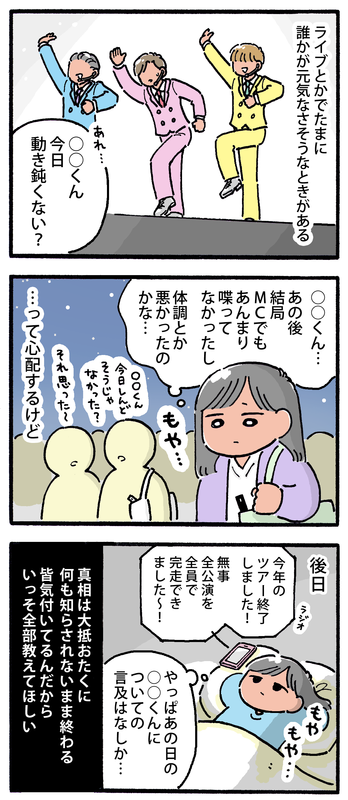 どした?今日お腹痛い?みたいな日、たまにある 2025年05月10日 ▼ランキングに参加しています↓押して応援してもらえると嬉しいです!▼Xとインスタで更新のお知らせしてます < 前の記事次の記事 > コメント コメント一覧 (2) 1. 匿名 2025年05月11日 05:55 M子さんのブログ見るようになってから、 茶の間はちゃんと推し活してるファンの人の意見を尊重するべきだなって思うようになりました 私は全然茶の間なんですけど、茶の間も推し活してる人も感想は対等、みたいにどこかで思ってたんですよね でもやっぱ、体調の悪さに気付けるくらい見てる人じゃなきゃ分からない事あるよなって 0 M子 がしました 2. M子 2025年05月11日 23:51 >>1 なるほど、確かに足を運んで実物を見た人のほうが得る情報量が多いのはありますね🤔 でもライブで同じものを見ても人によって全然違う感想だったなんてことも多々あるので、他人の感想なんて案外当てにならなかったりします😂 推しを見て感じたことはその人だけのものだし、誰の感想にも価値があると私は思いますよ❣️ 0 M子 がしました コメントフォーム 名前 コメント 記事の評価 リセット リセット 顔 星 情報を記憶 コメントを投稿する