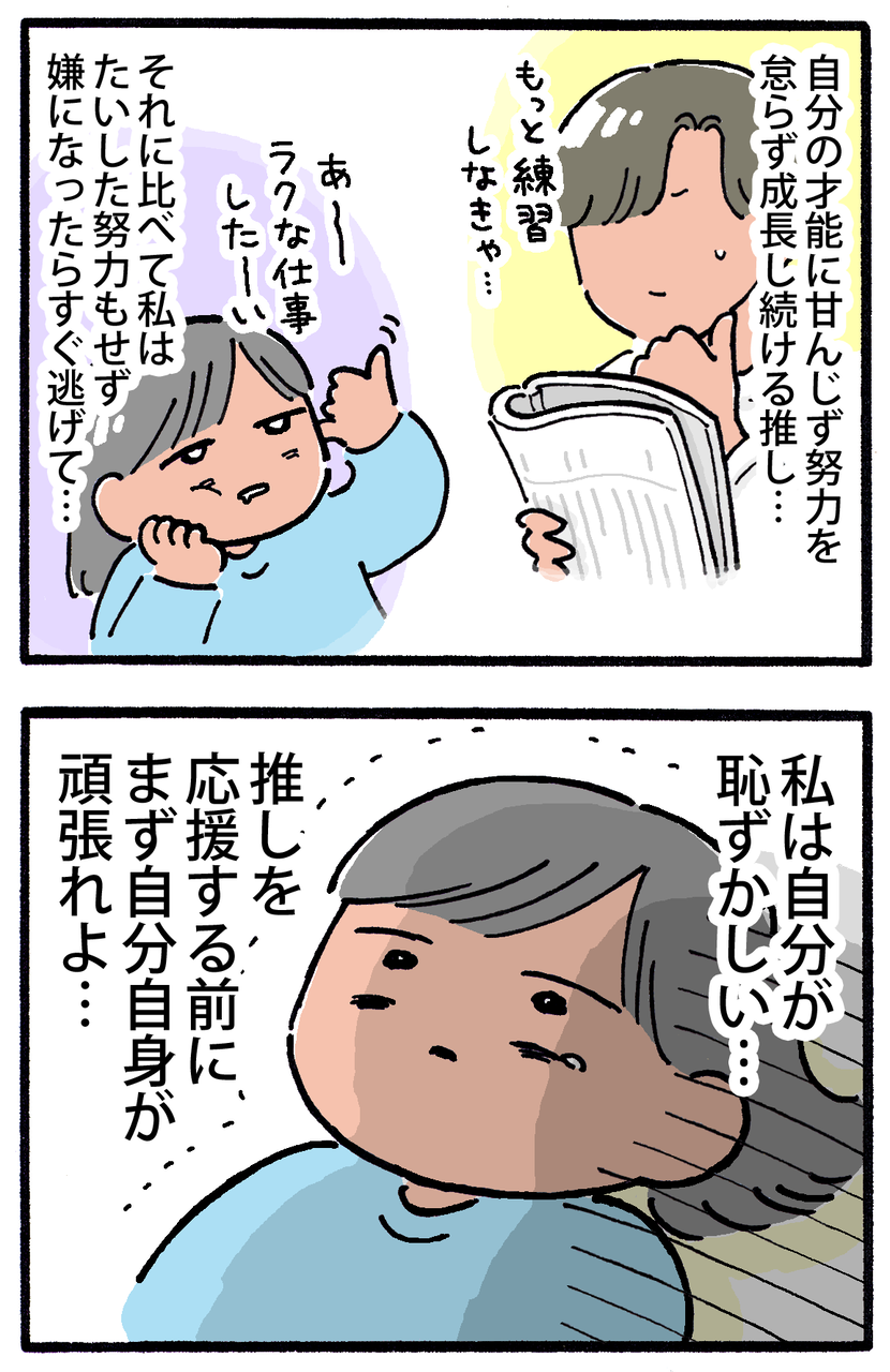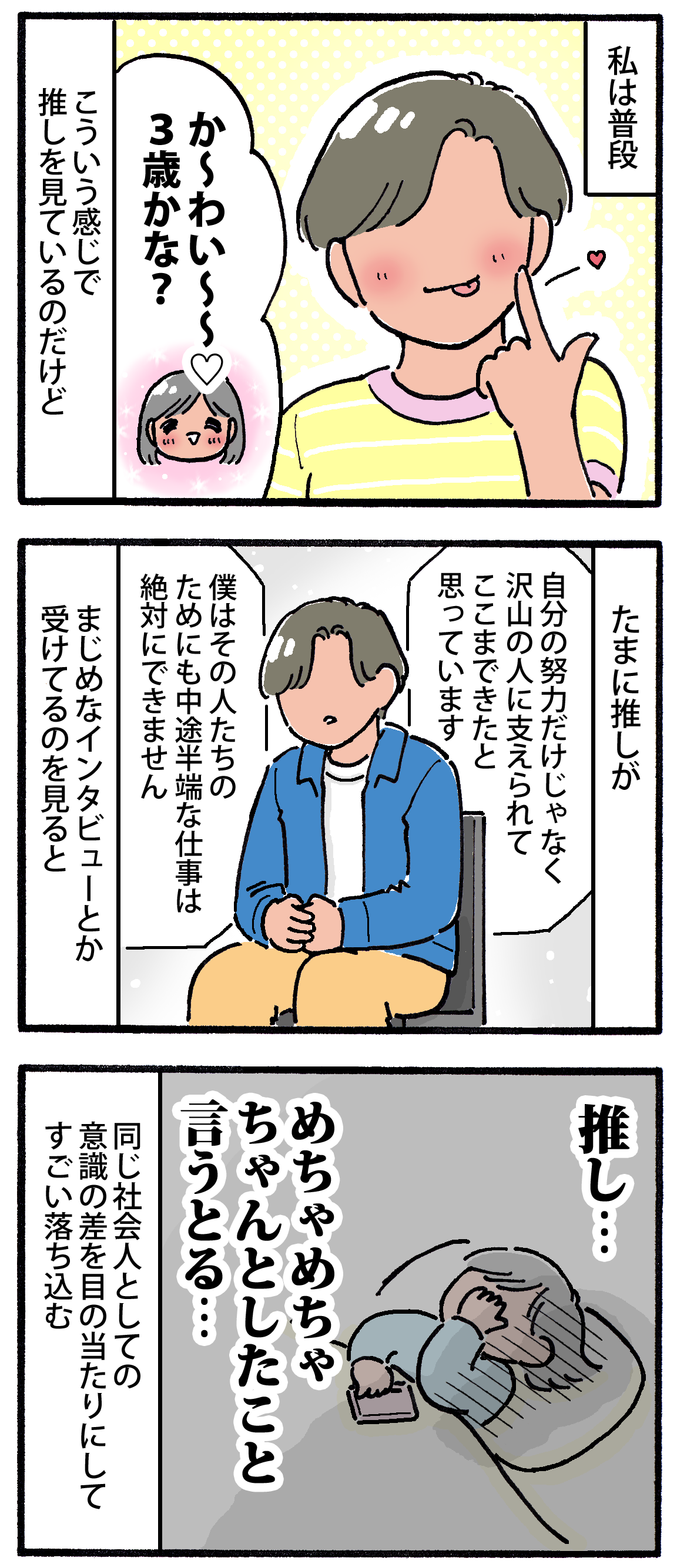 推しを応援できる人間になりたい 2025年07月06日 推しのまじめなインタビュー見るの毎回こわい😇(絶対へこむから)▼ランキングに参加しています↓押して応援してもらえると嬉しいです!▼Xとインスタで更新のお知らせしてます < 前の記事次の記事 > コメント コメント一覧 (4) 1. 匿名 2025年07月07日 06:32 わかりみが激し過ぎてもう凄いです 推しのああいうの、本音なのかな なんなら事務所に言わされてるとかでもいいよ・・・?とか思うレベルです 0 M子 がしました 2. M子 2025年07月08日 23:20 >>1 えっ?!まさかの事務所に言わされてる説?!😂 この気持ち分かってもらえて嬉しいです〜😭もっと自分に自信を持てるようになりたい😭 0 M子 がしました 3. みりん 2025年07月10日 22:59 M子さん、相変わらず自分に厳しい😅 3歳児に見せかけて、実は腹黒?ではないけど、ギャップとか結構萌えます✨️ 推し活こんなに根性いれてるし、その為に仕事もちゃんとやって稼いで、納税してるんですよ めちゃ頑張ってますよ✨️ 0 M子 がしました 4. M子 2025年07月12日 02:04 >>3 3歳児と見せかけて実際はちゃんとした成人男性だったんだ!!!(当たり前)っていうギャップ萌えの気持ち分かります!!!😭🫶 推し尊敬…そして自分情けな…という気持ちになり情緒が乱れまくります😂 わぁぁぁありがとうございます😭そう言ってもらえると自信が持てます…🙏✨️ 0 M子 がしました コメントフォーム 名前 コメント 記事の評価 リセット リセット 顔 星 情報を記憶 コメントを投稿する