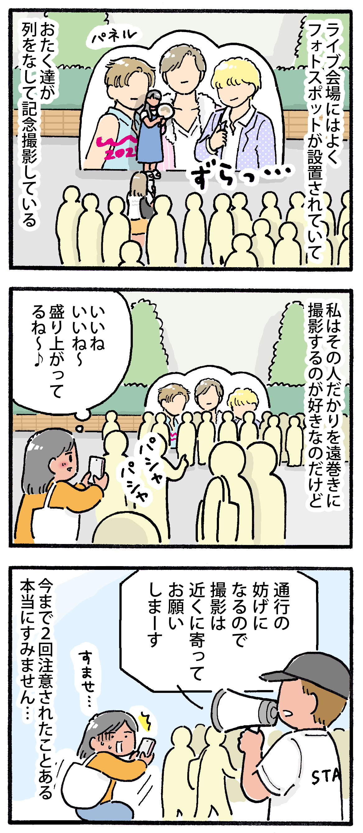 フォトスポットを撮りたいおたく 2025年08月30日 本当にすみません(でも寄りも引きもどっちも撮りたい…😭)▼ランキングに参加しています↓押して応援してもらえると嬉しいです!▼Xとインスタで更新のお知らせしてます < 前の記事次の記事 > コメント コメント一覧 (2) 1. みりん 2025年09月02日 12:27 最後のコマのM子さんが可愛すぎる 私も注意されたことありますよー やっぱり周りが見えなくなっている瞬間? そして私も寄りも引きもどちらも撮りたい・・・! たまに「撮りましょうか?」と声をかけてくれる方がいますが、お返しに撮るのが下手くそ過ぎていつも申し訳ない気持ちになります・・・ これもぼっちゆえなのか・・ 0 M子 がしました 2. M子 2025年09月05日 20:12 >>1 ありがとうございます!😊 みりんさんもあります?周囲に気を付けてるつもりでも夢中になっちゃうんですよね…本当に反省…😭🙏 わぁ〜〜撮りましょうかって声かけてくれるなんて優しいですね〜🥹✨私そんな経験ないので羨ましいです! 確かに人の写真撮るのって難しいですよね😂 でもファン同士お互い助け合って写真を撮り合うって素敵ですね❣️ 0 M子 がしました コメントフォーム 名前 コメント 記事の評価 リセット リセット 顔 星 情報を記憶 コメントを投稿する