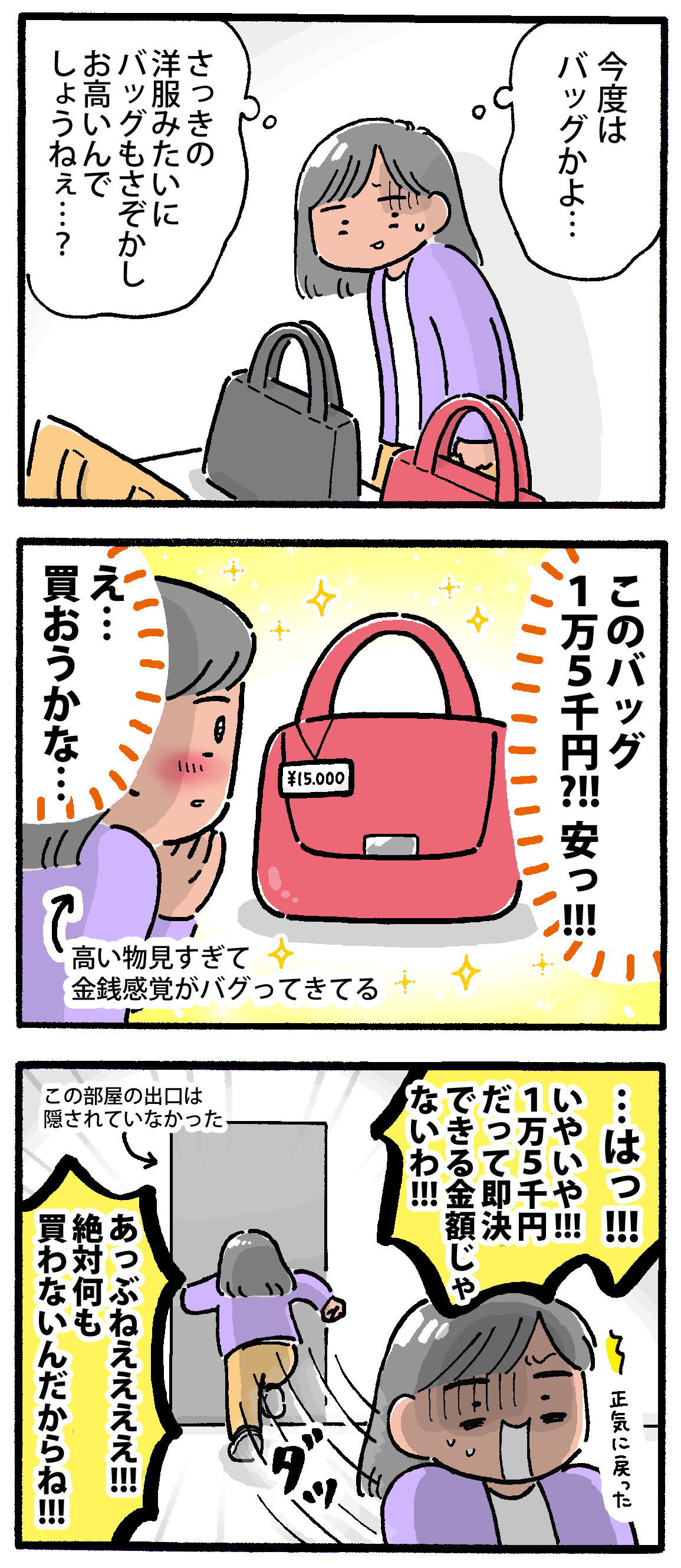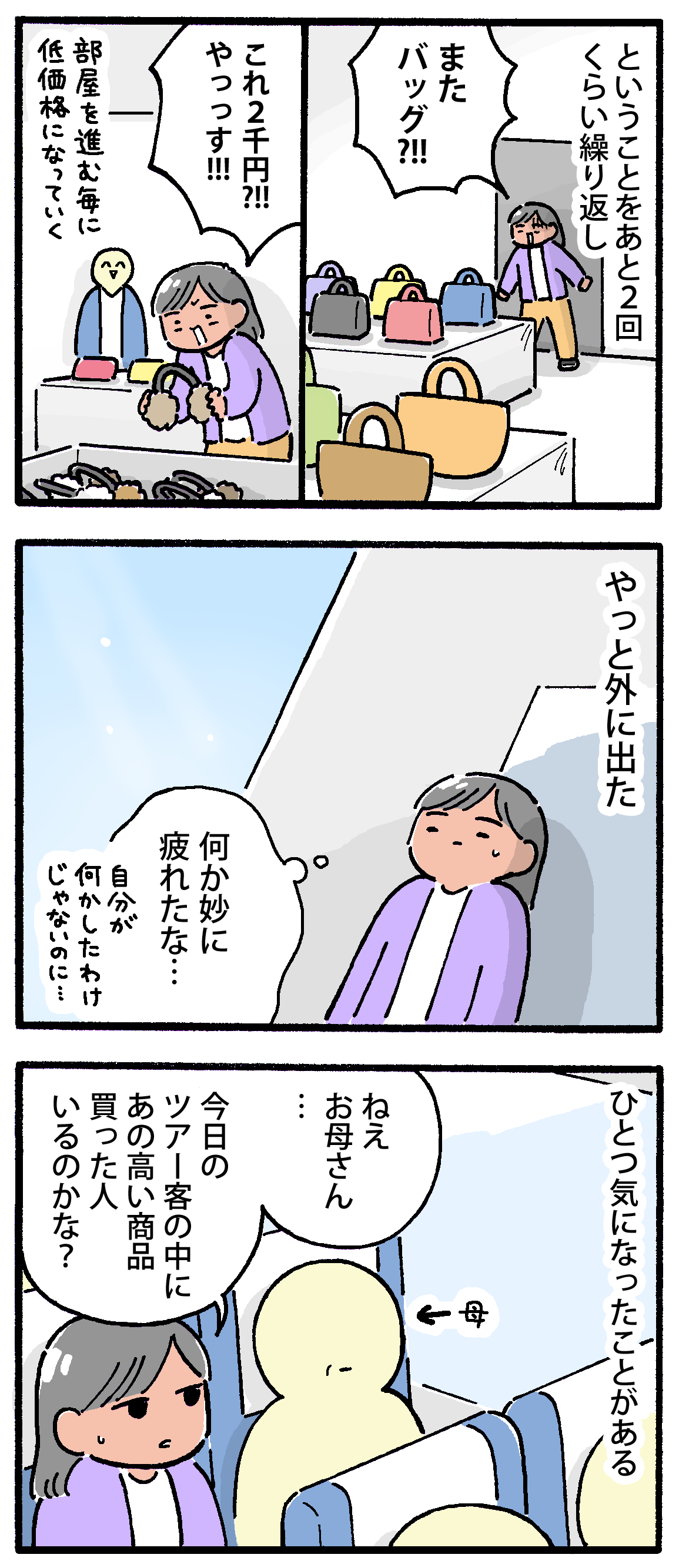 激安日帰りバスツアーに行ってきた【7】 2025年11月26日 ▼前の話はこちら激安日帰りバスツアーに行ってきた【1】激安日帰りバスツアーに行ってきた【2】激安日帰りバスツアーに行ってきた【3】激安日帰りバスツアーに行ってきた【4】激安日帰りバスツアーに行ってきた【5】激安日帰りバスツアーに行ってきた【6】次回へ続きます!🤔 (ビビって漫画内では会社名など伏せてますが、気になる方はお手数ですが「日帰りバスツアー 招待券」等で検索してみてくださいね🙏)▼ランキングに参加しています↓押して応援してもらえると嬉しいです!▼Xとインスタで更新のお知らせしてます < 前の記事次の記事 > コメント コメント一覧 (2) 1. みりん 2025年11月30日 09:16 わ、私買ってしまいそう🤣 思い出したのですが昔、友達が10万位のアクセサリーを買っている横でフラフラと1万位のアクセサリーを買ってしまったことがありました‥! なんか安く感じてしまったのですが、弾みで買うには勿体ない値段だった‥結局、ほぼつけてないし🥲 あっぶねええ!って逃げ去るM子さん‥! ちゃんと逃げてるー!偉いぃ✨️ 0 M子 がしました 2. M子 2025年12月05日 16:57 >>1 みりんさんの過去にそんなことが…! でも高価な物を見てると1万円くらいなら安く感じてしまいますよね〜💦私もこの時かろうじて逃げましたが一瞬買ってもいいかな…って気持ちになったので分かります😭 でも1万円ならまだ受け入れられる値段ですよ!これから付ける機会が増えるかもしれないですし🙆♀️ 0 M子 がしました コメントフォーム 名前 コメント 記事の評価 リセット リセット 顔 星 情報を記憶 コメントを投稿する