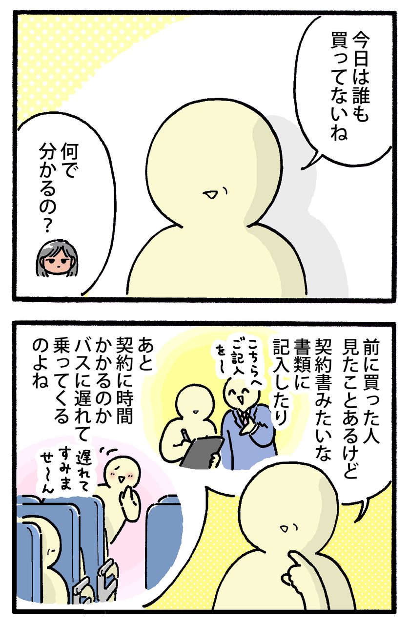 激安日帰りバスツアーに行ってきた【8】 2025年11月28日 ▼前の話はこちら激安日帰りバスツアーに行ってきた【1】激安日帰りバスツアーに行ってきた【2】激安日帰りバスツアーに行ってきた【3】激安日帰りバスツアーに行ってきた【4】激安日帰りバスツアーに行ってきた【5】激安日帰りバスツアーに行ってきた【6】激安日帰りバスツアーに行ってきた【7】毛皮会社のみで午前中終了😂次回へ続きます! (ビビって漫画内では会社名など伏せてますが、気になる方はお手数ですが「日帰りバスツアー 招待券」等で検索してみてくださいね🙏)▼ランキングに参加しています↓押して応援してもらえると嬉しいです!▼Xとインスタで更新のお知らせしてます < 前の記事次の記事 > コメント コメント一覧 (2) 1. みりん 2025年11月30日 09:22 本当にほぼ買い物ツアーなのですね ってそりゃそうなんでしょうが😅 高いものは売れなかったとして、バックとかは多少売れたんでしょうか?🤔 私も余計なこと考えてしまうタイプなので、時給だとしても1日これくらいかかるのでは?とかモヤモヤしていると思います😏 お母様、慣れている〜(笑) 最初はM子さんがお目付け役かと思っていたのに、超ベテランツアー客だった🤣 店員さんの笑顔たくさんのコマがホラーで面白いです😂 0 M子 がしました 2. M子 2025年12月05日 17:07 >>1 バッグより少額の小物とかを買ってる人は見かけました!でも大した売り上げにはならなそうだな〜って思いました🤔 そうなんです!時給とか考えちゃってモヤモヤしちゃいますよね〜(かといって自分は買わないのですが😂) 母もそうなんですが、他のお客さんも慣れた人ばっかりでした😂 ホラー!(笑)可愛く描いたつもりだったので意外な感想にめちゃウケました😂ありがとうございます❣️☺️ 0 M子 がしました コメントフォーム 名前 コメント 記事の評価 リセット リセット 顔 星 情報を記憶 コメントを投稿する