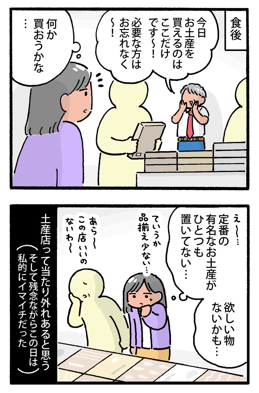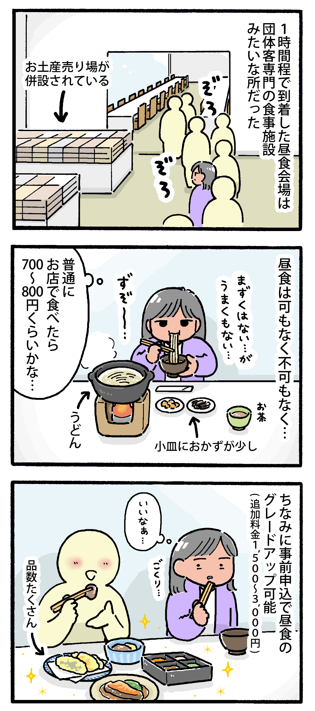 激安日帰りバスツアーに行ってきた【9】 2025年12月05日 ▼前の話はこちら激安日帰りバスツアーに行ってきた【1】激安日帰りバスツアーに行ってきた【2】激安日帰りバスツアーに行ってきた【3】激安日帰りバスツアーに行ってきた【4】激安日帰りバスツアーに行ってきた【5】激安日帰りバスツアーに行ってきた【6】激安日帰りバスツアーに行ってきた【7】激安日帰りバスツアーに行ってきた【8】1週間ぶりの更新になってしまいました🙏💦次回へ続きます! (ビビって漫画内では会社名など伏せてますが、気になる方はお手数ですが「日帰りバスツアー 招待券」等で検索してみてくださいね🙏)▼ランキングに参加しています↓押して応援してもらえると嬉しいです!▼Xとインスタで更新のお知らせしてます < 前の記事次の記事 > コメント コメント一覧 (2) 1. みりん 2025年12月08日 19:44 うどん‥!うどんだけなのですか‥! 固形燃料付きの鍋で出してくるなら、せめて鍋とご飯位出して欲し〜😅 プラス料金して参加する人は、ご飯料金に無料バスが付いてきてるみたいな感じ? お土産は普通に売れるものを置けば、お店に利益が生まれると思うのに‥謎だらけです 就職とかはしたくないけど、この会社の内側からカラクリを覗きたい😁 0 M子 がしました 2. M子 2025年12月18日 01:00 >>1 ツアーによって昼食の内容は変わるらしいのですが、この日はほぼうどんでした😂 料金はツアー参加費が1人目が無料、2人目(同伴者)からは1人につき6千円で、昼食のグレードアップ希望の場合は更に追加料金支払う感じです!私と母は昼食グレードアップしてないので、参加費6千円のみ支払いでグレードアップ無しのうどんを食べたということになります🙋♀️(説明下手ですみません😭) お土産は残念すぎました…お店にも事情があるのかもしれませんが…🥲 この会社謎すぎますよね!どれだけ利益が出てるのかも気になります🤔 0 M子 がしました コメントフォーム 名前 コメント 記事の評価 リセット リセット 顔 星 情報を記憶 コメントを投稿する
