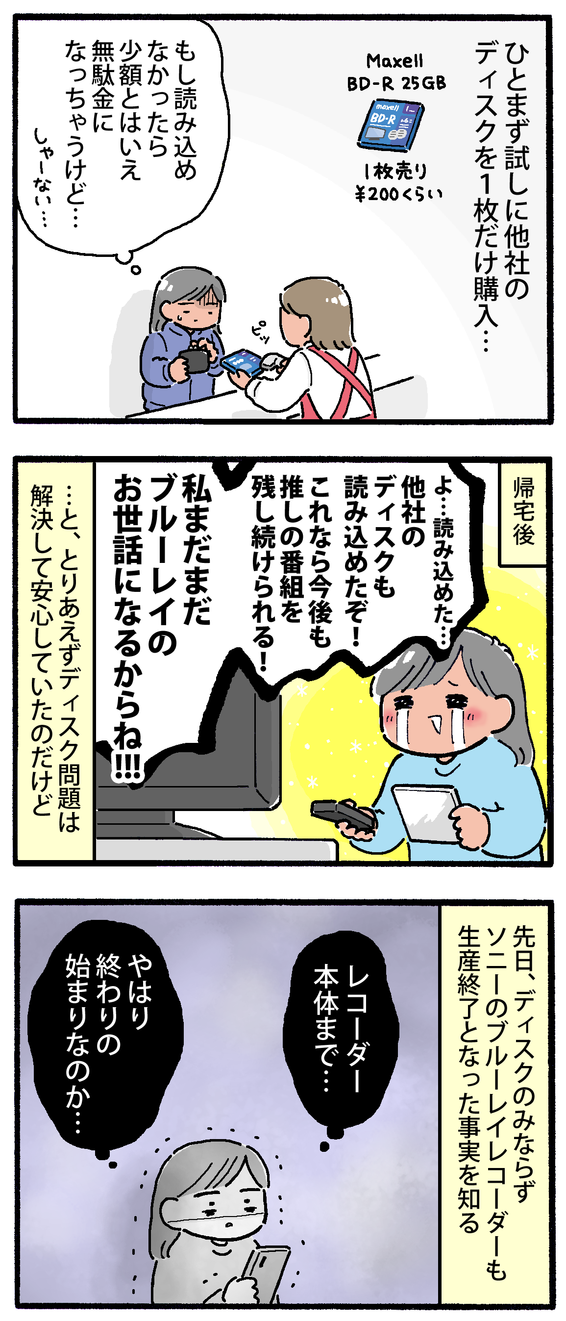 ソニーがブルーレイレコーダー撤退してた 2026年02月18日 情弱すぎて最近まで全然知らなかった😭まだ他社がレコーダーやディスクの製造を続けてるから、今すぐどうこうって話ではないとはいえ…もうそういうフェーズに入ってるじゃんこれ…▼ランキングに参加しています↓押して応援してもらえると嬉しいです!▼Xとインスタで更新のお知らせしてます < 前の記事次の記事 > コメント コメント一覧 (2) 1. みりん 2026年02月19日 21:22 そうなんですか!知らなかったです😳💦 そういえば友人が、もうHDDを録画用にしてるから、ディスク使わんと言ってました‥ しかしそもそもブルーレイすら?今は配信あるから保存しなくていいやって感じなのでしょうか‥ ファンクラブとかもネット会員のみとか増えてますもんね そうだ、雑誌も廃刊続きでしたね‥😱 オタクは物が欲しいのに‥! 0 M子 がしました 2. M子 2026年02月28日 16:19 >>1 みりんさん、お返事遅くなって申し訳ありません!😭🙏 そうなんです、今は配信に移行していて円盤の需要が減少傾向にあるらしく…🥲 みりんさんのご友人のようにHDDを使われてる方も多いのかもしれません🤔 でもそうですよね!オタクはデータじゃなくて物が欲しいんですよ!😭 それにこれまでに買い集めたライブとかドラマの円盤もいつか見れなくなるんじゃないかと思うと今から不安です…🥲 0 M子 がしました コメントフォーム 名前 コメント 記事の評価 リセット リセット 顔 星 情報を記憶 コメントを投稿する