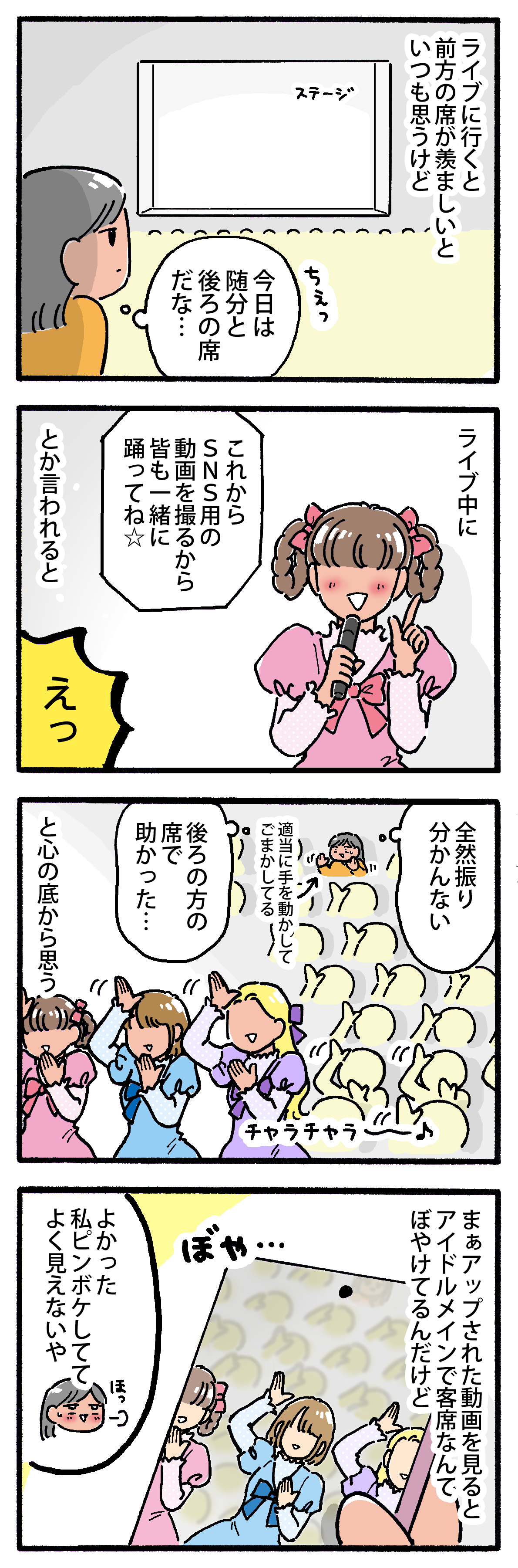 私は振りコピできないタイプのおたく 2026年03月25日 毎回、無駄にヒヤヒヤしてる😇▼ランキングに参加しています↓押して応援してもらえると嬉しいです!▼Xとインスタで更新のお知らせしてます < 前の記事次の記事 > コメント コメント一覧 (2) 1. みりん 2026年03月26日 19:44 あぁ〜🤣分かります‥! 「一緒に踊って〜💞」とか楽しそうに言われるけど、私の場合はリズム感が全くなく‥隣の人と違うタイミングで腕上げてる‥となって真っ白になって踊れない😵 狭い座席で完コピしてる子とかいてびっくりしつつ尊敬‥そして振付やダンスは完璧なのに、中身ちょっとアホな推しとか、どういうことなの?? そしてそのアンバランス差に余計推しに課金を‥話がズレてますね すみません😅 0 M子 がしました 2. M子 2026年03月29日 11:12 >>1 踊りは向き不向きありますよね〜😂 私もめちゃくちゃ練習したとしてもぎこちない動きになってしまいます💦リズムに乗って自然と体を動かせる人が羨ましいです🥺✨ 分かります!アイドルやアーティストって喋るとぽやぽやしてても、ライブのときは歌もダンスも導線もほぼ完璧に覚えていて凄いな〜っていつも思います🤔 才能もあるかもしれないですが、裏でめちゃくちゃ努力してるの想像したら更に好きになりますよね😭✨ 0 M子 がしました コメントフォーム 名前 コメント 記事の評価 リセット リセット 顔 星 情報を記憶 コメントを投稿する