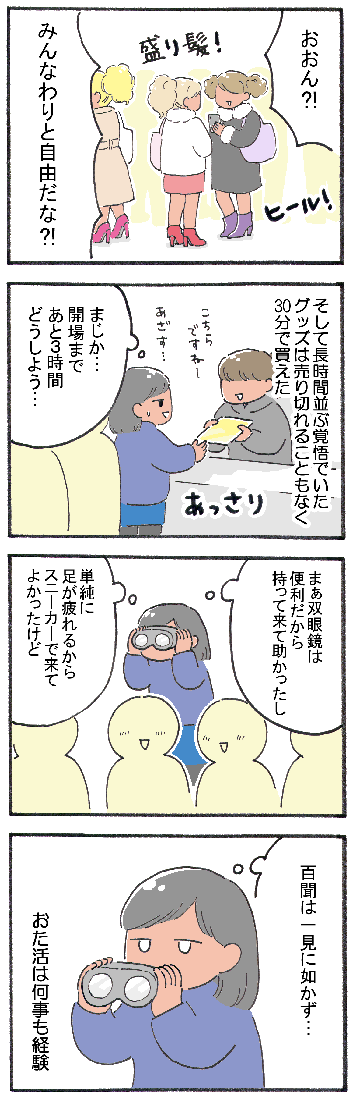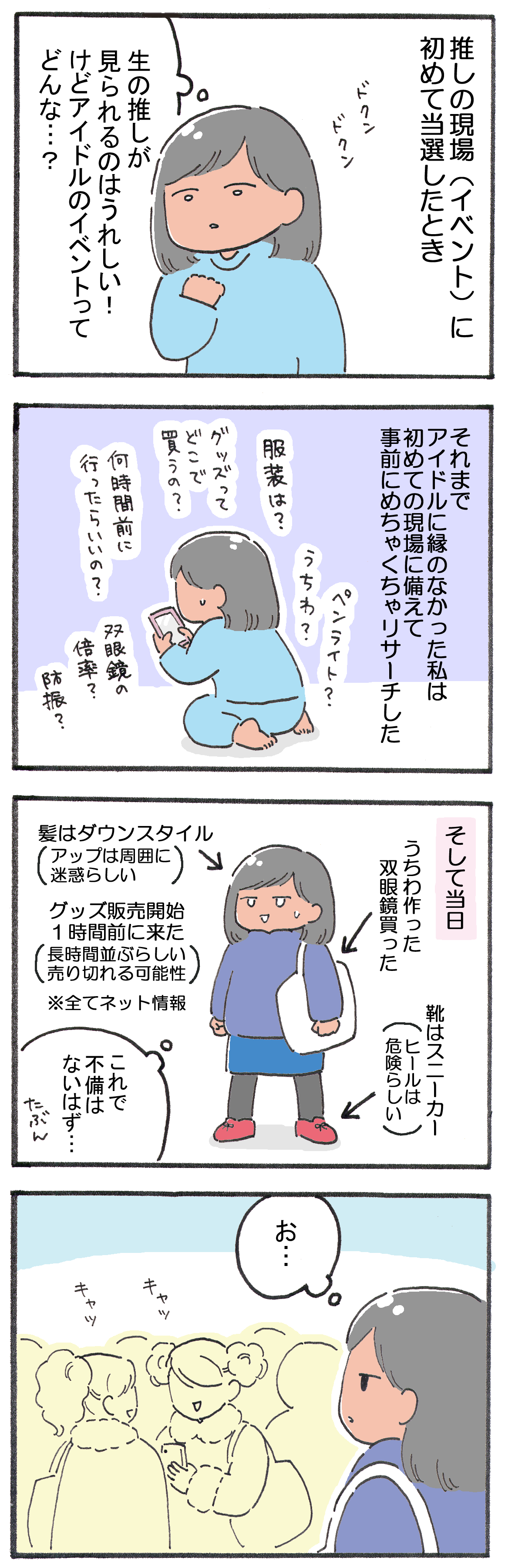 新参が初めての現場に備えた結果 2020年06月24日 5、6年前は現場でよく見かけましたよね、盛り髪のおたく。▼開場までの3時間に私が見たもの▼参加しています < 前の記事次の記事 > コメント コメント一覧 (2) 1. りか 2020年07月01日 02:53 ちょい前のにコメントすみません。 自由な人もいるけどやはり後ろの人には迷惑です、特にアリーナだと。「マナー違反の人」はいるけどできれば基本に忠実にみんなにはいてほしいです、それがマナーなので…。 せっかくアイドルについて書いていて他の初心者の方も読まれるので空気読めないコメントすみません…。 0 M子 がしました 2. M子 2020年07月01日 21:32 >>1 コメントありがとうございます☺️ いえいえ、私の表現には至らないところもあるかと思うので、こうしてコメントでご意見いただけるのはとてもありがたいです☺️ マナー違反を推奨する意図はなかったのですが確かにそう読めてしまうかもしれないですね🤔💦 私も周囲に迷惑をかけないというマナーの意識は大前提だと思っています🙏 0 M子 がしました コメントフォーム 名前 コメント 記事の評価 リセット リセット 顔 星 情報を記憶 コメントを投稿する